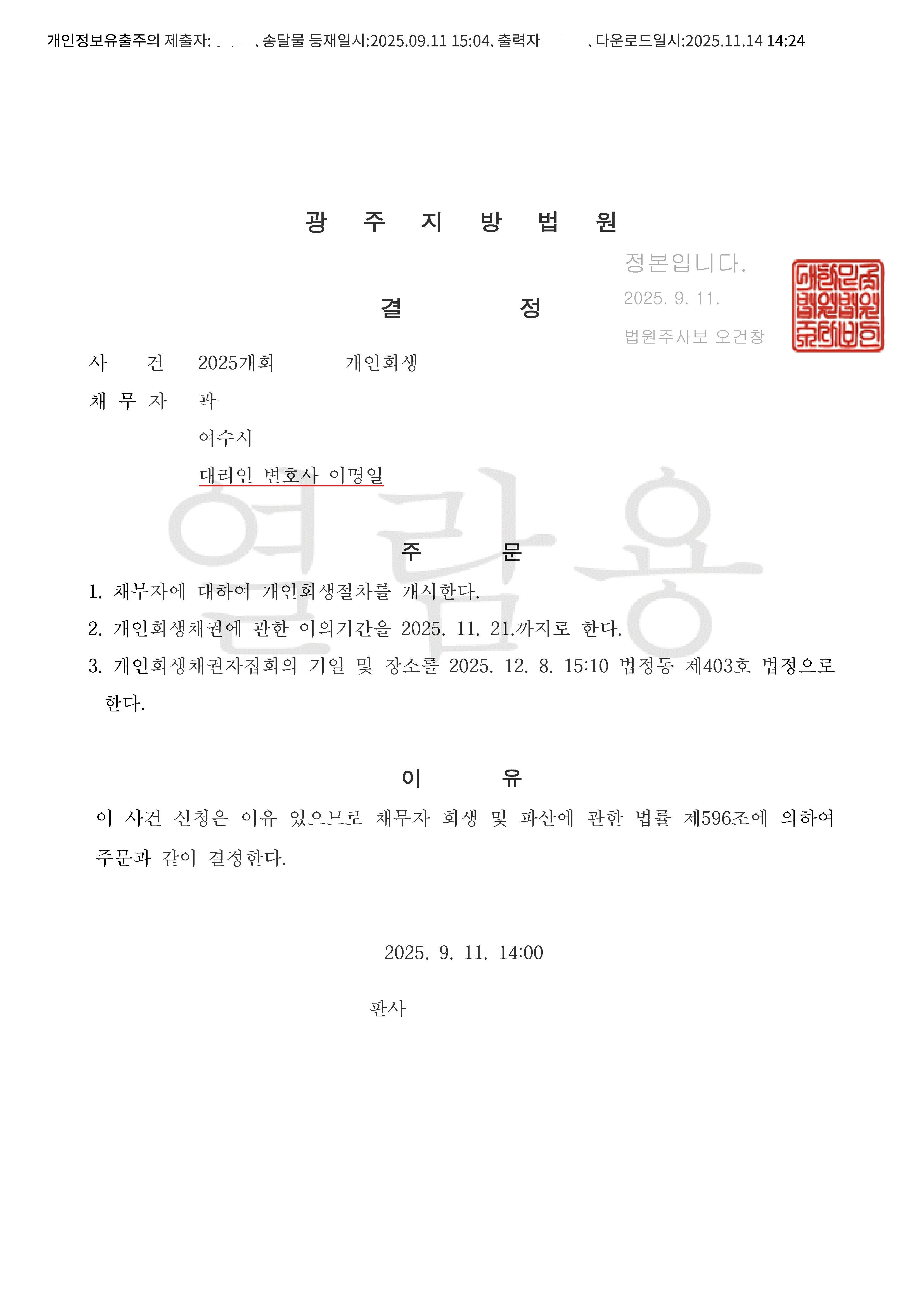 | [개인파산] 면책 결정 - 여수 개인파산 변호사 (0) | 2025.11.14 |
